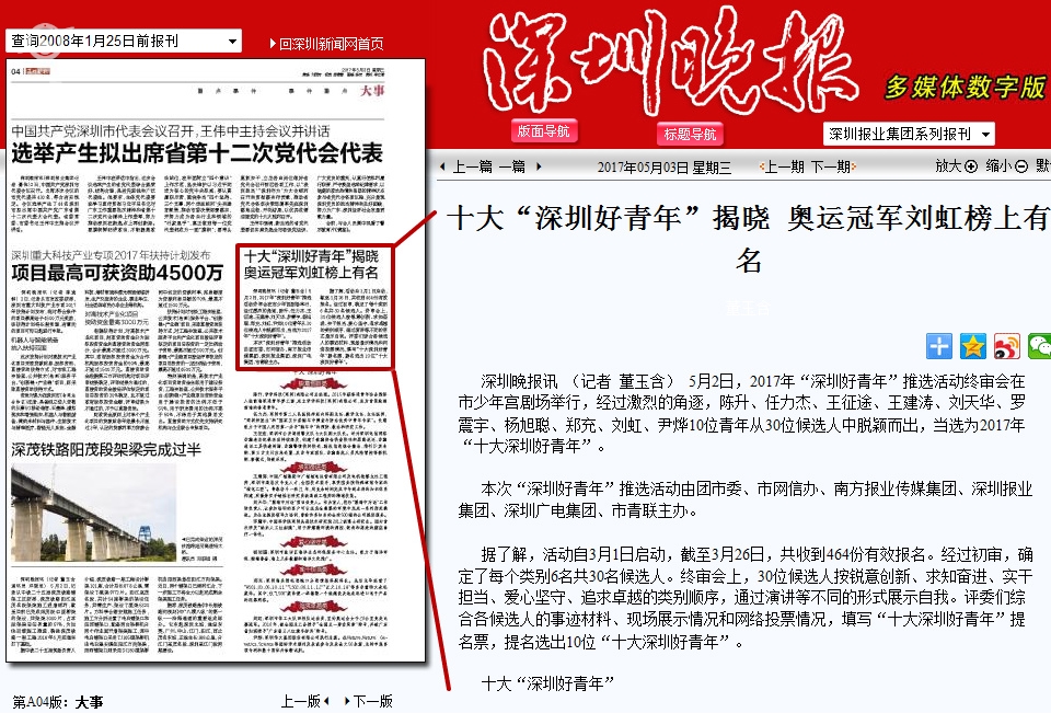 〖深圳晚报〗十大“深圳好青年”揭晓 奥运冠军刘虹榜上有名